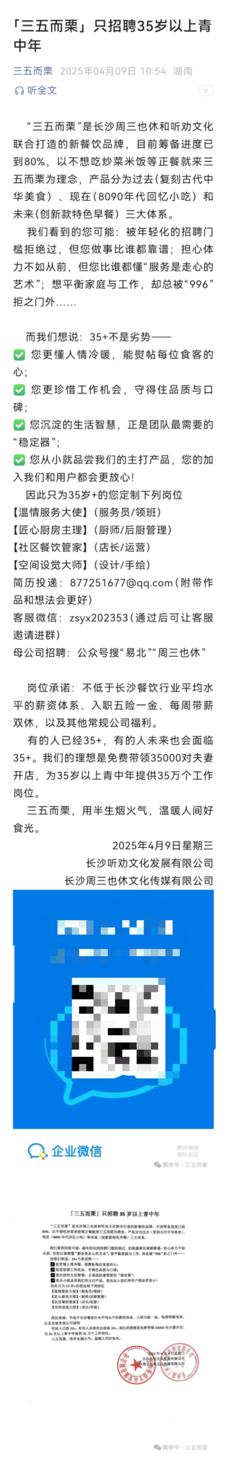一餐饮公司仅招35岁以上员工: 已有数百人咨询